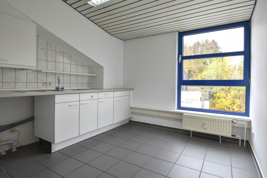 Im hinteren Bereich öffnet sich der Flur zur Fensterseite hin und bietet ausreichend Platz für einen Ess- oder Aufenthaltsbereich. Direkt angrenzend befindet sich die Teeküche. Am Ende des Flurs befindet sich ein großzügiges, tageslichtdurchflutetes Büro, das durch seine weiträumige Gestaltung zahlreiche Nutzungskonzepte ermöglicht. Ein weiteres, durch Verglasung abgetrenntes Büro schafft Privatsphäre bei gleichzeitig angenehmer Transparenz und Lichtdurchlässigkeit.
