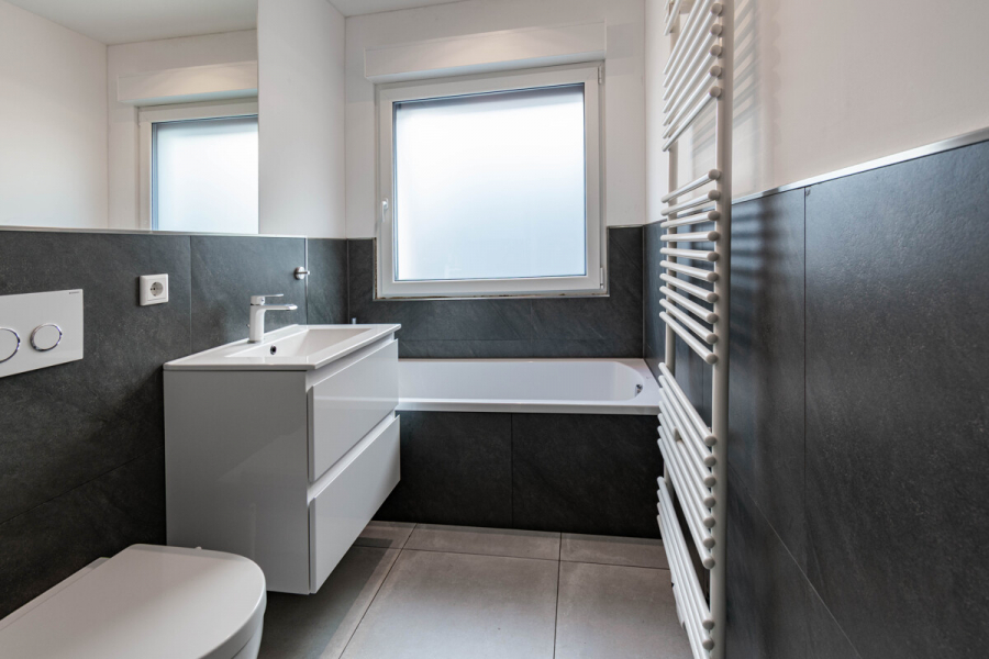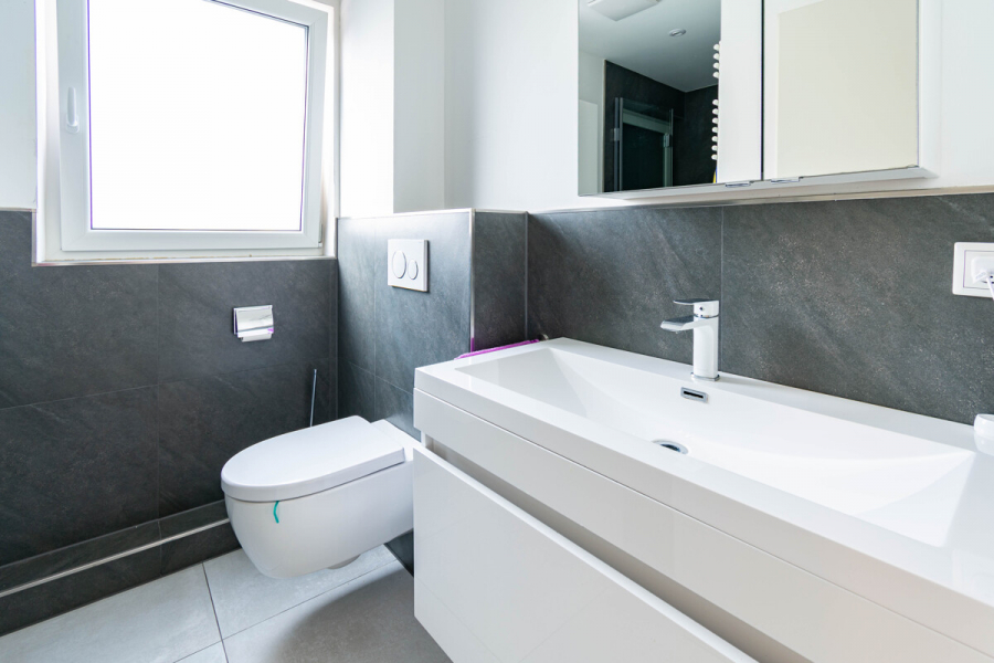 Anthrazitfarbene Feinsteinfliesen in den Bädern – modernes, zeitloses Design