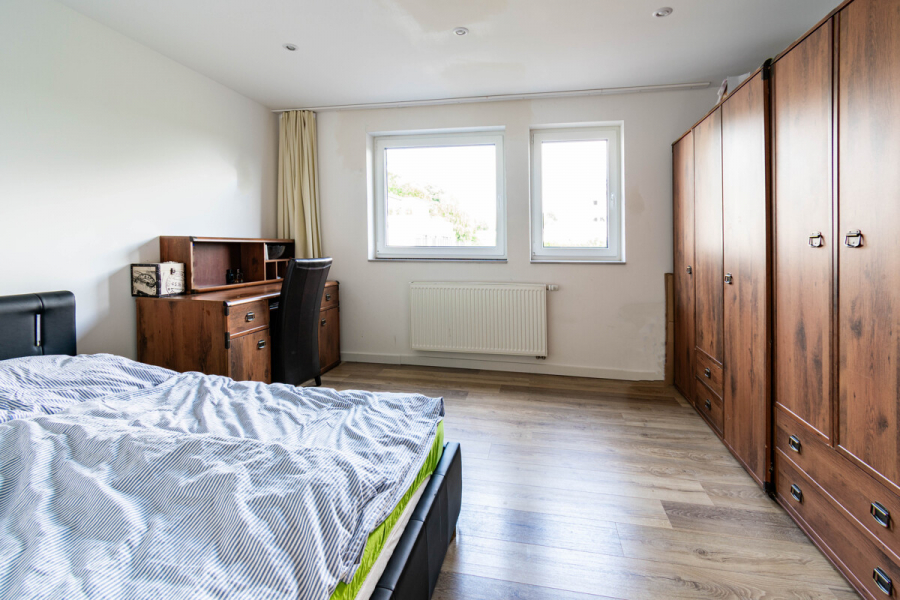 Vom Schlafzimmer im Erdgeschoss aus genießen Sie einen schönen Blick ins weitläufige Grundstück und direkten Zugang auf die großzügige Terrasse – ein idealer Rückzugsort mit Südwestausrichtung. Ein modernes Badezimmer mit Badewanne, ein Gäste-WC sowie ein praktischer Hauswirtschafts-/Abstellraum mit direktem Zugang zur Terrasse runden das Erdgeschoss ab.