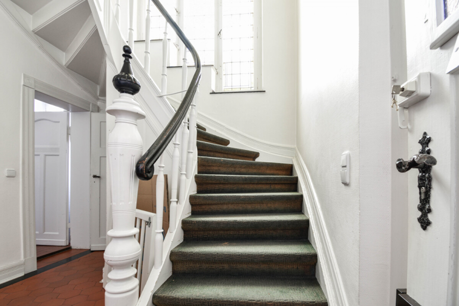 Besondere architektonische Highlights sind das großzügige Treppenhaus mit sehr schönem Holzgeländer und detailreicher Verkleidung sowie das große bleiverglaste Fenster im Treppenhaus, ein Exemplar im Jugendstil. Dieses kunstvolle Element lässt farbiges Licht eindrucksvoll ins Hausinnere fallen und betont den historischen Charakter der Immobilie. Ein weiterer Blickfang ist der imposante, gekachelte Ofen im Wohnbereich, der als Feuerstätte registriert ist und zusätzlich zu seinem nostalgischen Charme auch funktionale Wärme spendet.