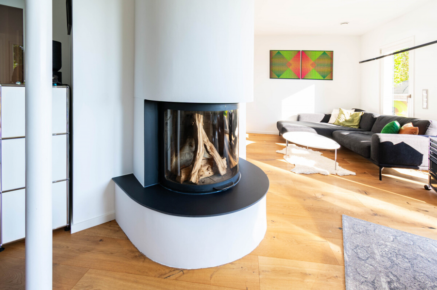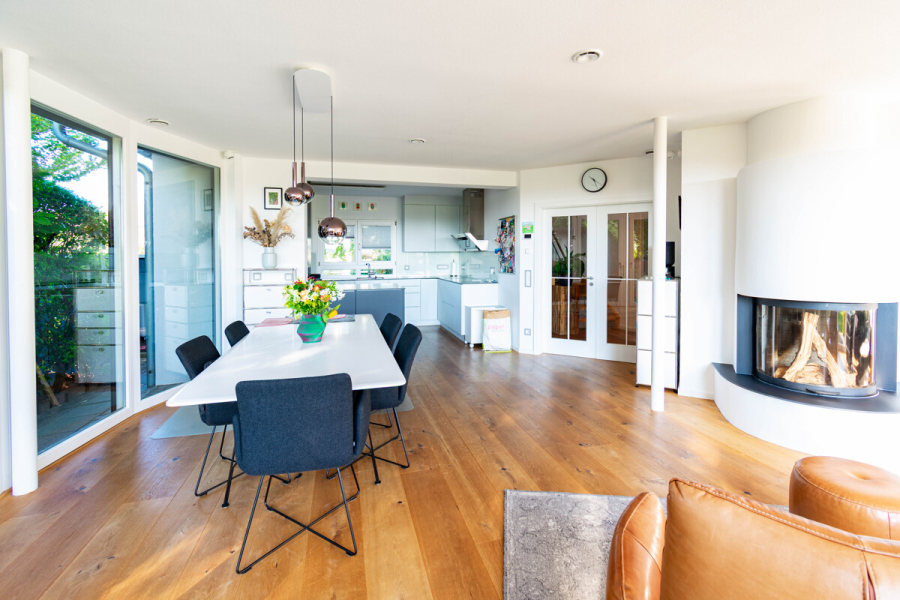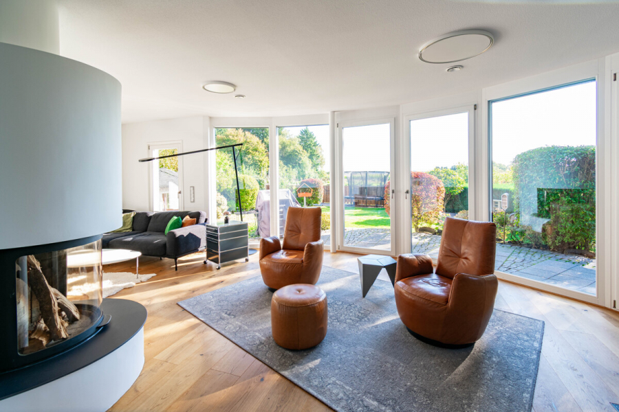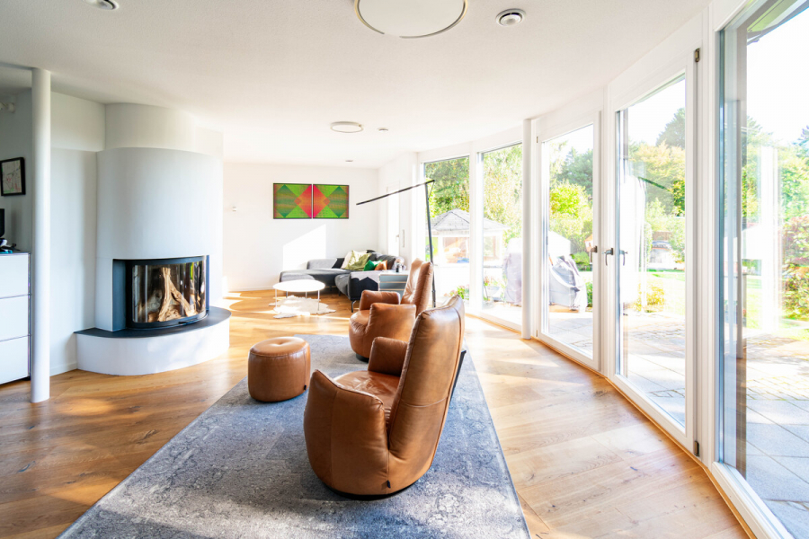 - Kamin im Wohnzimmer, bodentiefe Fenster mit unverbaubarem Blick ins Grüne
