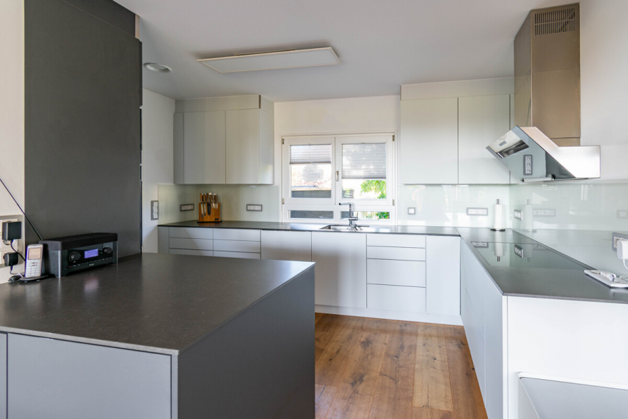 Die Küche überzeugt mit einer hochwertigen Einbauküche im modernen Push-to-Open-System – ästhetisch, funktional und stilvoll zugleich. Ergänzt wird das Raumangebot durch praktische Details wie elektrisch betriebene Rollläden, maßgefertigte Plissees und geschmackvolle Innentüren.
