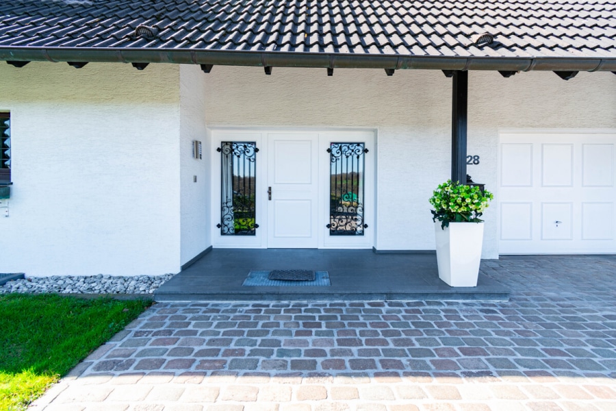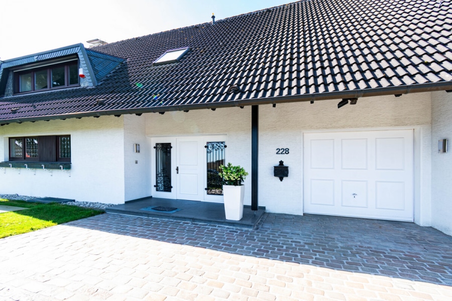 Die große, gepflasterte Auffahrt sowie eine geräumige Garage, die Platz für zwei Fahrzeuge in Reihe bietet, sorgen für ausreichend Parkmöglichkeiten. Besonders komfortabel ist der direkte Zugang von der Garage ins Haus.