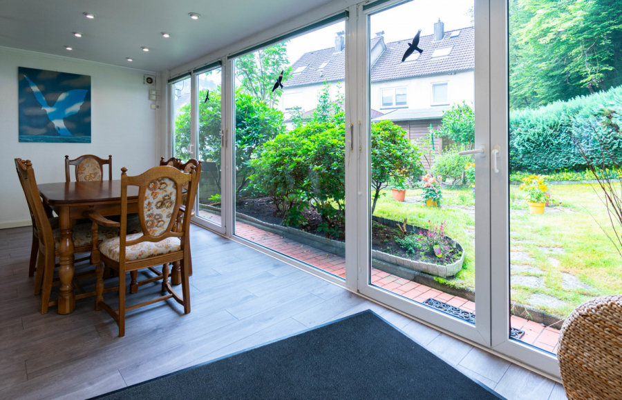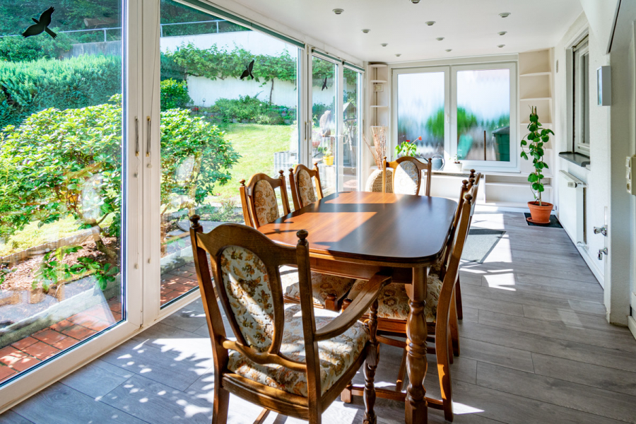 Über den durch ein solides Vordach geschützten Eingang betreten Sie die freundliche und tagesbelichtete Diele. Hier befindet sich auch gleich das nützliche Gäste-WC. Das Erdgeschoss verfügt auf ca. 68 m² über ein geräumiges Wohn-/Esszimmer mit Zugang zum Wintergarten und zur Terrasse sowie über eine gemütliche Küche mit Einbauküche. Der pflegeleichte Garten bietet trotz der geringen Größe verschiedene Verweilzonen.