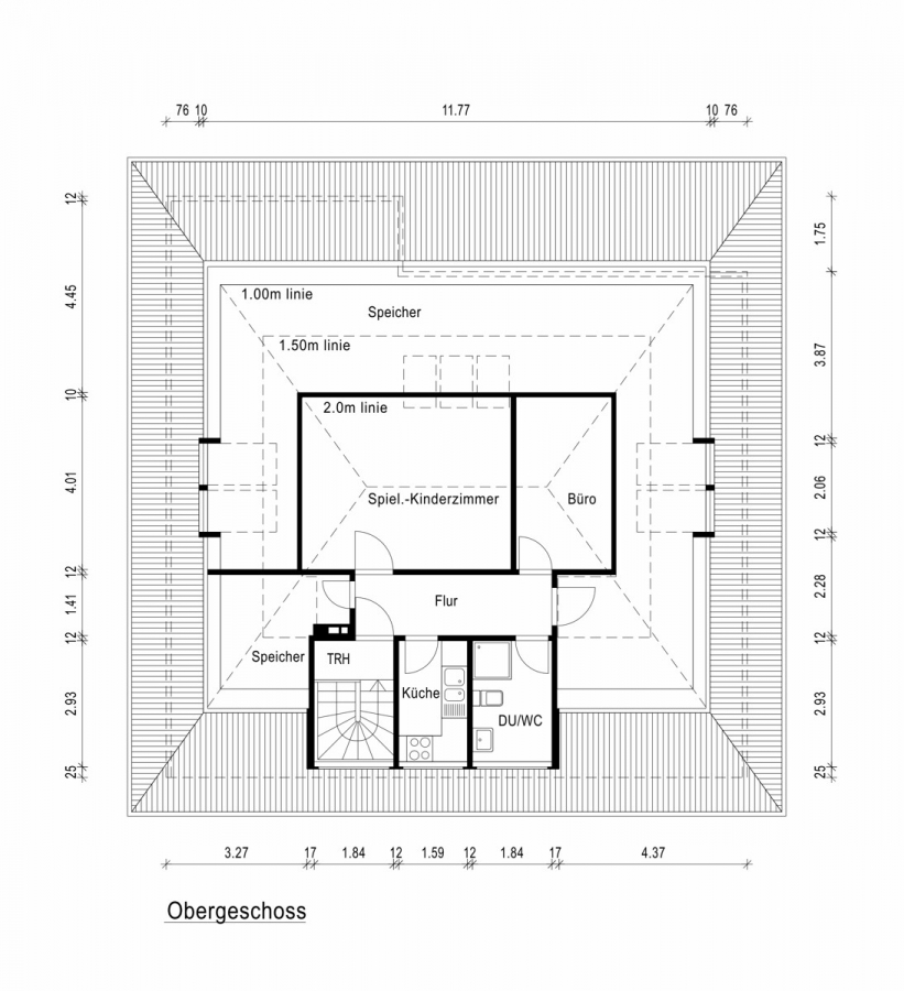 Im Obergeschoss erwartet Sie ein großer, derzeit offen gestalteter Raum mit sichtbaren Holzelementen, der flexibel in zwei oder mehr Zimmer unterteilt werden kann – ideal für Kinder, Gäste oder zur Einrichtung eines großzügigen Homeoffice. Ergänzt wird das Dachgeschoss durch ein Duschbad, eine kleine Küche (ebenfalls als Büro nutzbar) sowie einen praktischen Abstellraum.