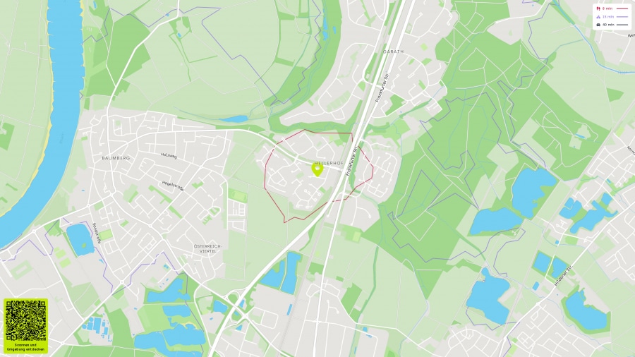 Die Immobilie liegt in einem gewachsenen, angenehm ruhigen Wohnumfeld im Düsseldorfer Süden (Hellerhof) – ideal für alle, die entspannt wohnen und im Alltag dennoch kurze Wege schätzen. Hier treffen eine familienfreundliche Nachbarschaft, viel Grün und eine sehr gute Infrastruktur aufeinander.