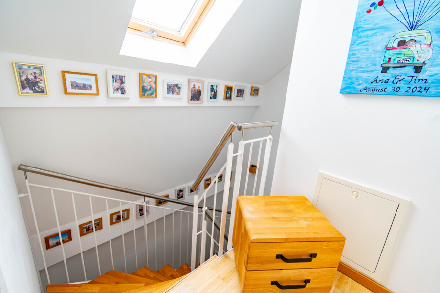 Die Aufteilung: EG = Eingang mit Flur, Abstellraum und Treppe, WC mit Fenster und Waschmaschinen-/Trocknerstellplatz, Wohn-/Essraum mit offener Küche und Terrasse/Garten. OG = Schlafraum, großes Wannenbad mit Fenster, Flur mit Treppe. Die Fenster im OG haben Schlagläden. DG = Schlaf-/Arbeitsraum, Duschbad mit Fenster, Flur mit Treppe.