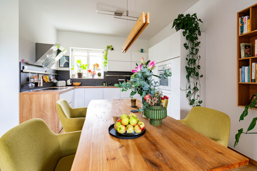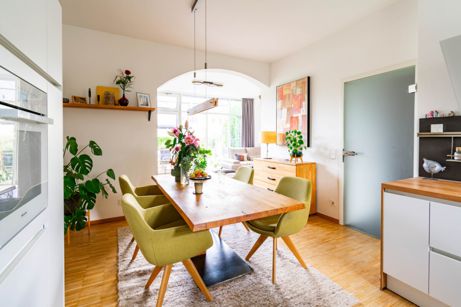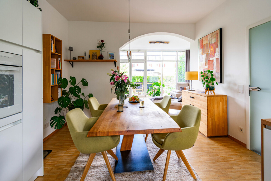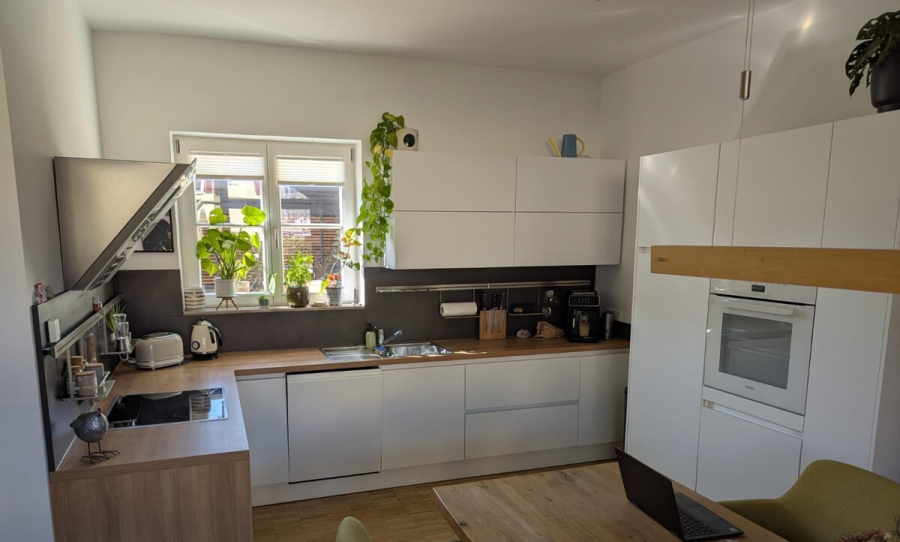 • EG = Eingang mit Flur, Abstellraum und Treppe, WC mit Fenster und Waschmaschinen-/Trocknerstellplatz, Wohn-/Essraum mit offener Küche. Die hochwertige Einbauküche ist erst 2 Jahre alt und verbleibt als Ausstattungsdetail im Objekt. Ebenfalls wurden im Erdgeschoss an den großen Glasflächen im Wintergarten und im Küchenbereich neutrale Plisses installiert, die im Objekt kostenfrei verbleiben.