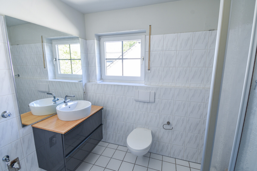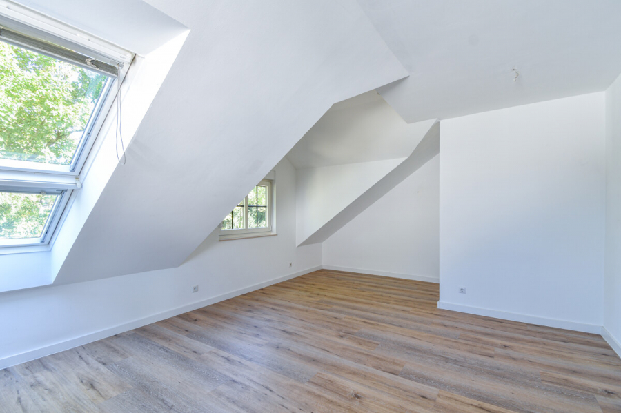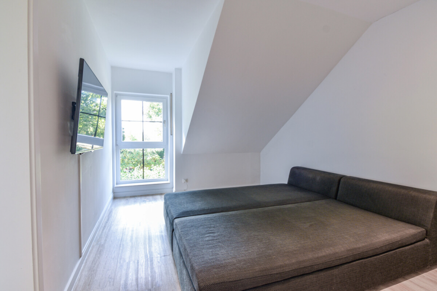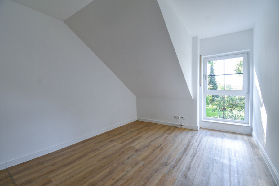 Das Dachgeschoss überzeugt mit einem offenen, hellen Raum, der wahlweise als zweiter Wohnbereich oder als großzügiges Schlafzimmer genutzt werden kann. Hinzu kommt ein weiteres, ruhig gelegenes Schlafzimmer mit angrenzendem Arbeits- oder Ankleidezimmer. Ein kleiner Technikraum beherbergt die Gas-Brennwerttherme, von hier aus führt auch der Zugang zum bereits nachträglich gedämmten Dachboden – ideal als Stauraum oder erweiterbare Nutzfläche. Auch das Obergeschoss eignet sich bei Bedarf zur Abtrennung als eigenständige Wohneinheit, etwa bei einer Nutzung mit erwachsenen Kindern oder im Sinne eines Mehrgenerationenhauses.