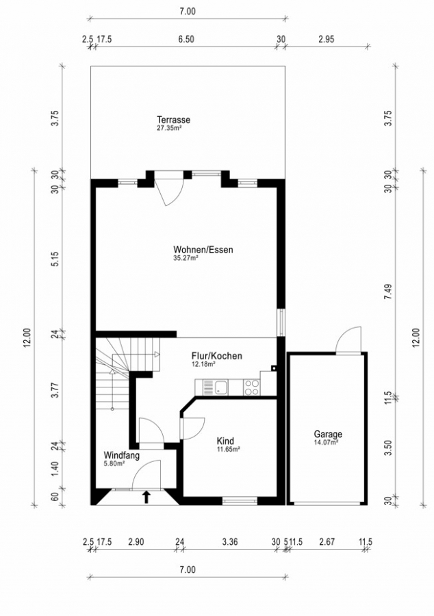 Im Erdgeschoss befindet sich ein offener, einladender Wohn- und Essbereich, der gemeinsam mit der Küche den kommunikativen Mittelpunkt bildet. Ein weiteres Zimmer – perfekt als Kinderzimmer, Büro oder Gästezimmer – sorgt für zusätzliche Flexibilität auf dieser Ebene. Ursprünglich war eine Wendeltreppe vorgesehen, die das Wohnzimmer mit dem Dachgeschoss verbindet.