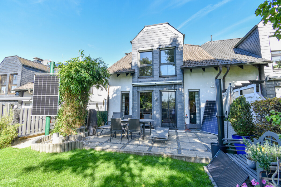 Auch der Außenbereich überzeugt: Eine Garage mit 11 kW-Wallbox bietet nicht nur Platz für das Auto, sondern auch einen direkten Durchgang in den Garten – eine praktische Verbindung für Alltag und Freizeit. Ein liebevoll gepflegter Garten mit großzügiger Terrasse lädt zum Entspannen ein. Ausgestattet mit Markise, Solarpaneelen, einer Solardusche und einem im Jahr 2025 neu errichteten Zaun bietet er zusätzlichen Komfort und Privatsphäre.