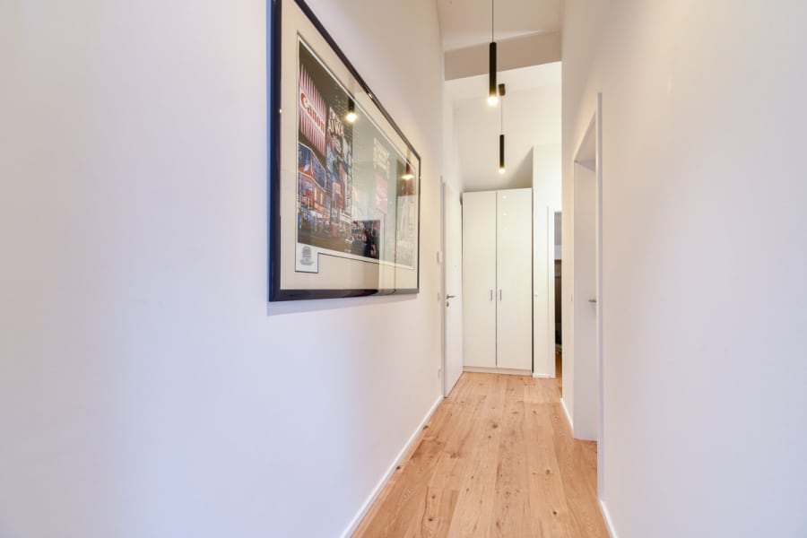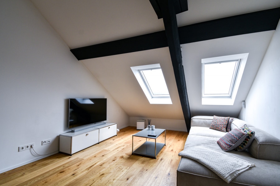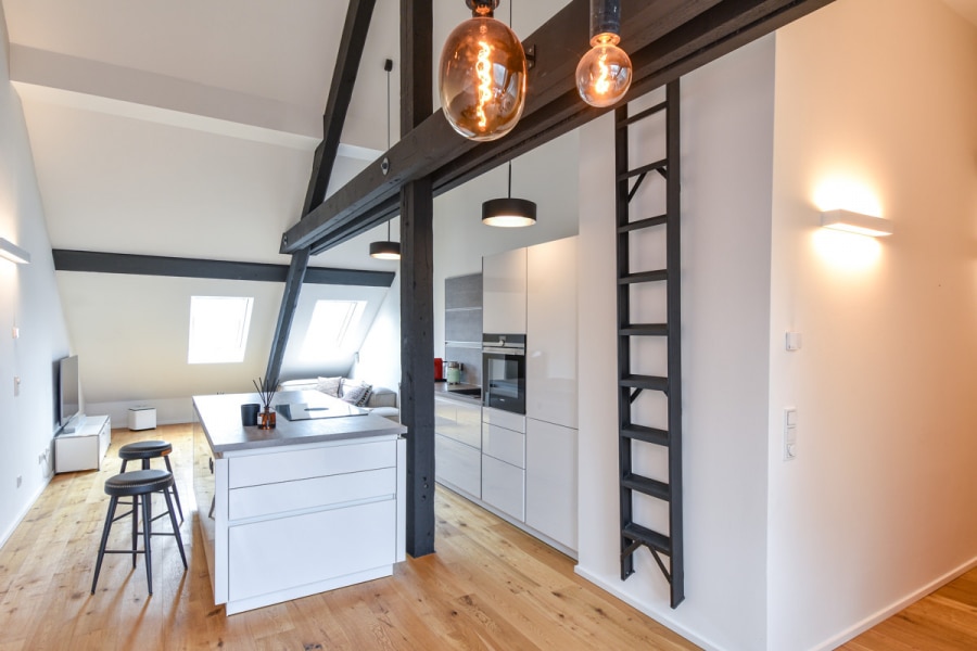 Diese einzigartige 2-Zimmer-Wohnung befindet sich im Dachgeschoss des unter Denkmalschutz stehendem "Gut zum Hof" aus dem Jahr 1877, welcher im Jahr 2020 umfangreich saniert wurde. Die Wohnfläche von ca. 72 m² verteilt sich auf ein Wohn-/Esszimmer mit offener Küche (inkl. hochwertiger Einbauküche), ein Schlafzimmer, ein Hauswirtschaftsraum mit Waschmaschinen- und Trockneranschluss, ein separates Gäse-WC sowie ein großes Badezimmer mit Walk-In-Dusche und Badewanne. Über eine Leiter gelangt man auf den über dem Badezimmer liegenden Spitzboden, der Ihnen zusätzlichen Stauraum bietet.