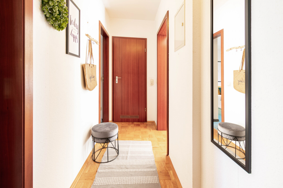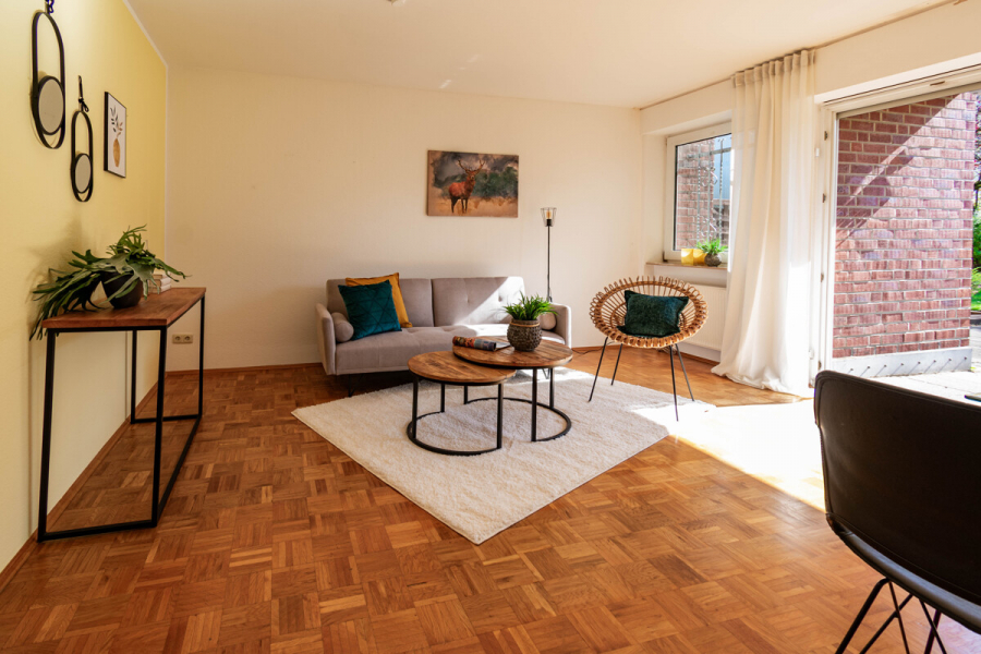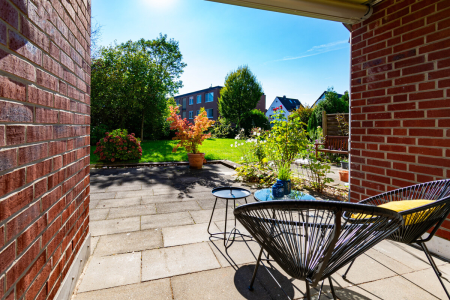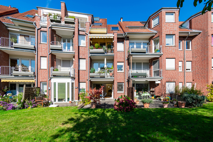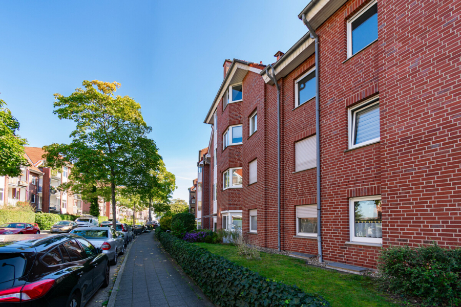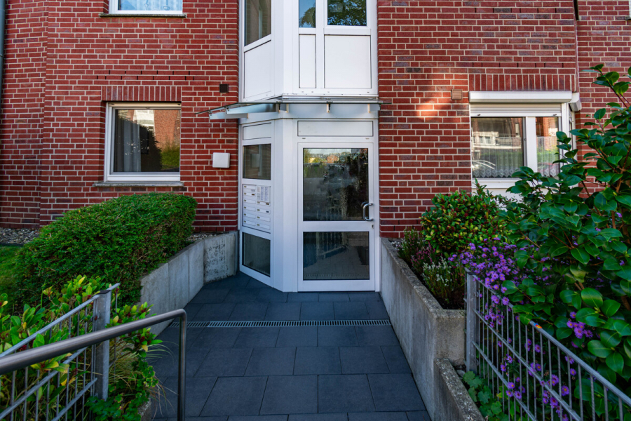 Die Wohnung selbst präsentiert sich in einem sehr gepflegten Zustand. 2018 wurde eine hochwertige Biffar-Sicherheitstür eingebaut, 2016 das Badezimmer komplett erneuert und mit einer bodengleichen Dusche ausgestattet. Bereits 2014 wurde an der Terrassenschiebetür eine Lewens-Kassettenmarkise installiert, die an sonnigen Tagen für angenehmen Schatten sorgt. Elektrische Rollläden, durchgehend Fliegengitter – auch an der großen Terrassenschiebetür – sowie ein einheitlicher Stäbchenparkettboden in den Wohnräumen unterstreichen den wertigen Eindruck. Die Klinkerfassade des Gebäudes fügt sich harmonisch ins gepflegte Wohnumfeld ein.