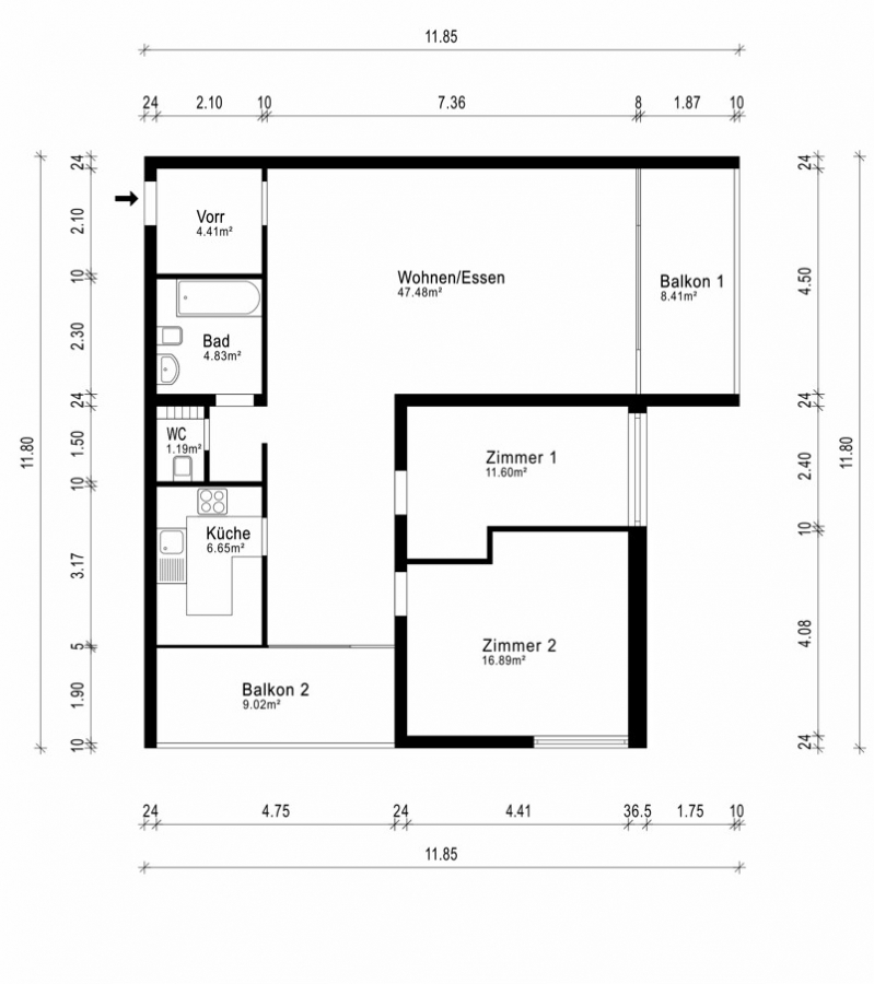 Außergewöhnlich schöner Schnitt. 101 m². Entwicklungspotenzial. Zwei Balkone.