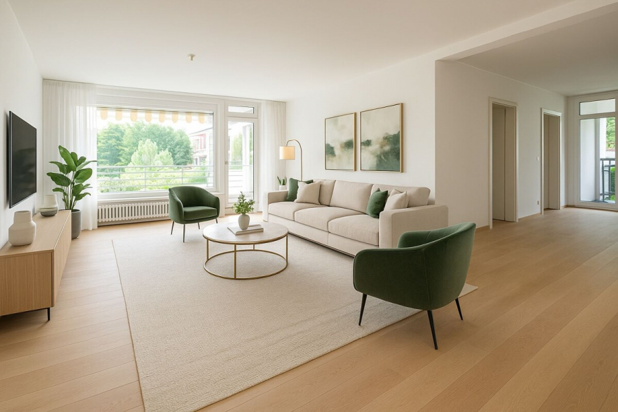 Die Wohnung befindet sich in einem Mehrfamilienhaus aus dem Jahr 1962 und beeindruckt bereits beim Betreten durch ihr durchdachtes Raumkonzept. Der Windfang mit praktischem Einbauschrank führt in ein offen gehaltenes Entreé, das sich fließend in den ca. 32 m² großen Wohn- und Essbereich erstreckt. Dieser bildet das Herzstück der Wohnung – lichtdurchflutet, mit idealer Ausrichtung und direktem Zugang zum ersten Balkon mit Blick ins Grüne. Der Wohnraum überzeugt durch seine Helligkeit, Weite und die charmante Verbindung zu den weiteren Bereichen der Wohnung.
