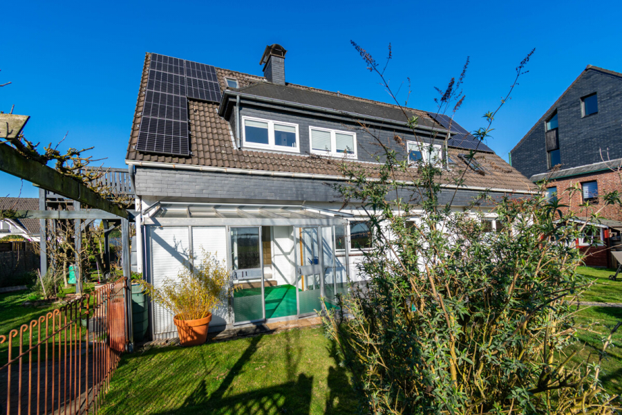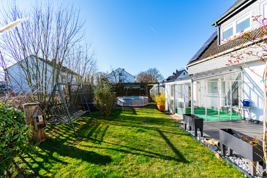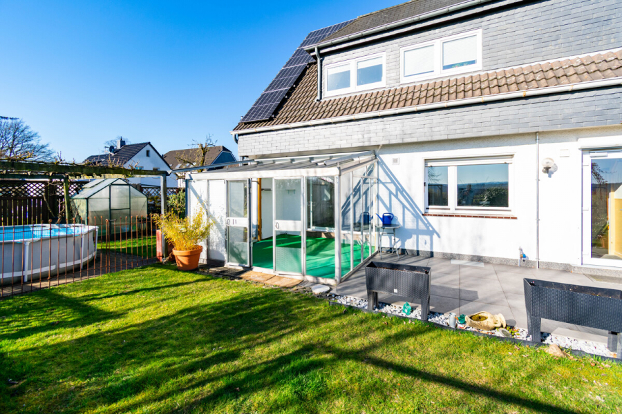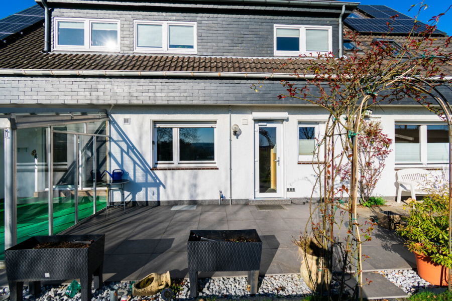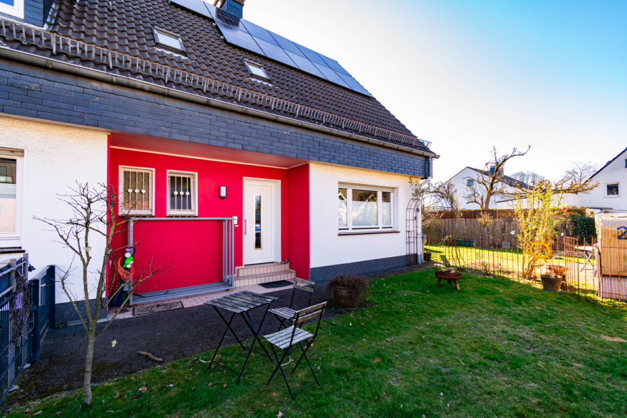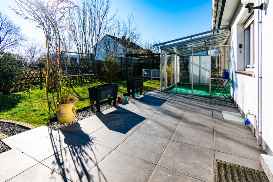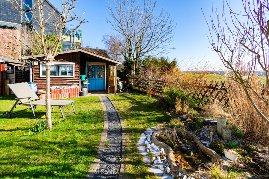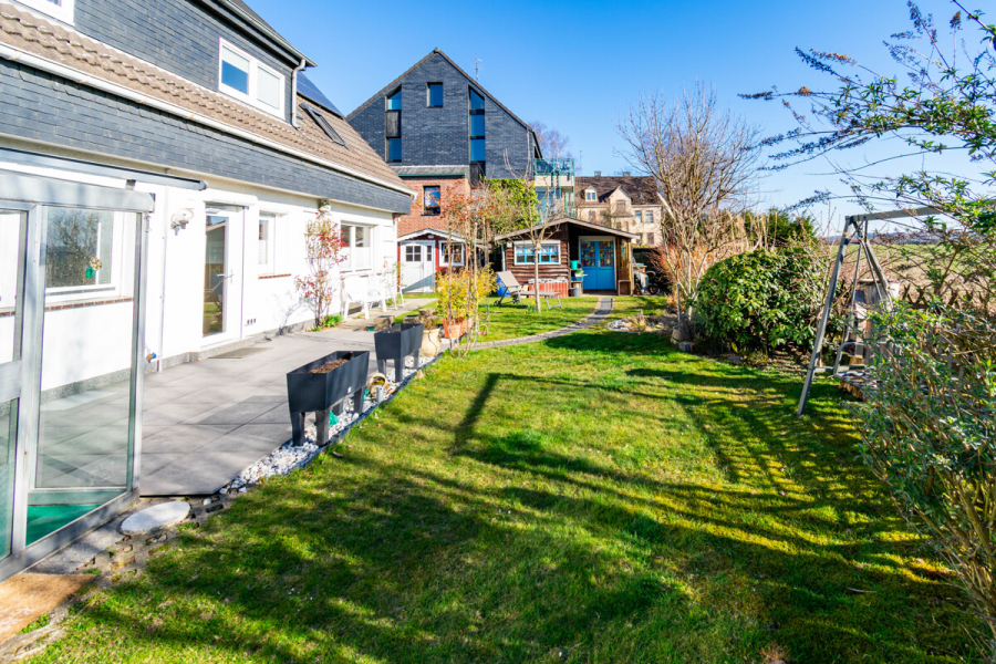 Sowohl vom Wohnbereich als auch von der Küche gelangen Sie auf die weitläufige Terrasse und in den großen, pflegeleicht angelegten und vollständig eingefriedeten Garten, der Ihnen zur Verfügung steht. Hier können Kinder spielen, Haustiere frei laufen oder Sie einfach die Sonne genießen. Ein geräumiges Gartenhaus sorgt für zusätzlichen Stauraum und bietet Platz für Garten- und Terrassenutensilien. Ein Highlight ist der unverbaute Blick über die Felder bis nach Cronenberg.