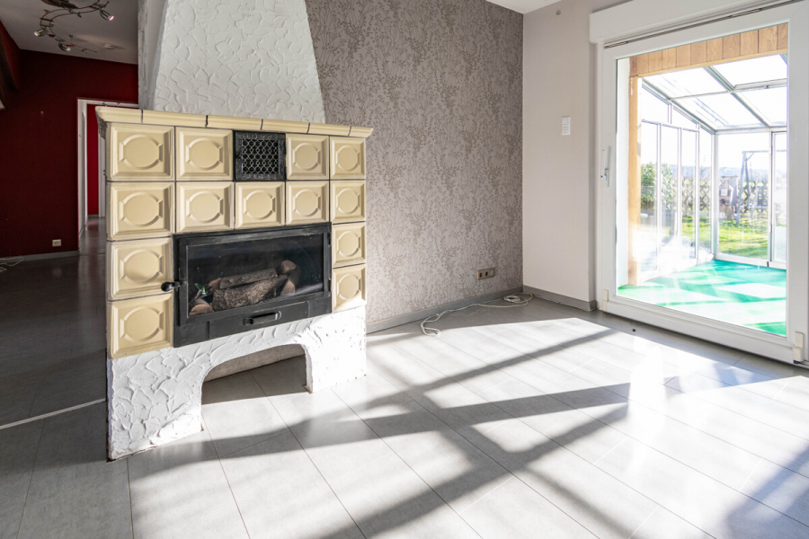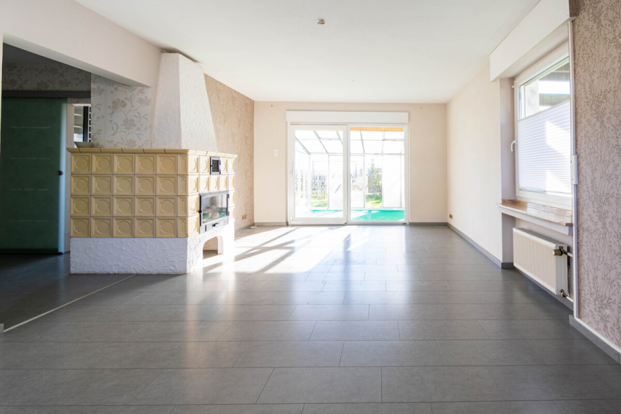 Ein großzügiger Wohnbereich, der durch einen stilvollen Kamin eine behagliche Atmosphäre schafft und eine direkte Verbindung zum offenen Sommergarten bietet.