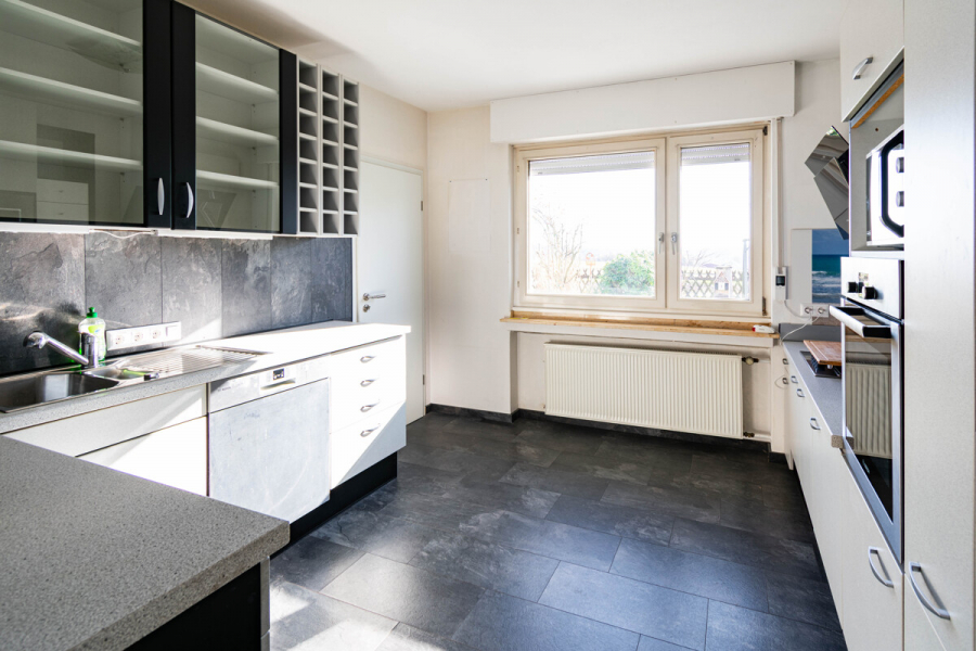 Eine einladende, sinnvoll ausgestattete Küche mit Zugang zur weitläufigen Terrasse und dem eigenen Keller.