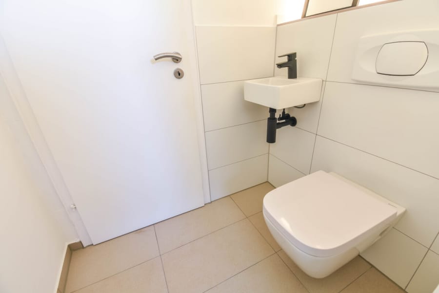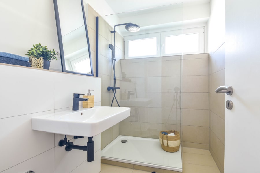 Das moderne Badezimmer mit hochwertiger, bodengleicher Walk-in-Dusche unterstreicht den gehobenen Anspruch an Komfort und Design. Zeitlose, weiße Wandflächen schaffen eine helle, ruhige Atmosphäre, die durch sandfarbene Fliesen harmonisch ergänzt wird. Hier verbinden sich Ästhetik und Alltagstauglichkeit auf überzeugende Weise.