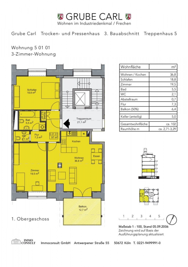 "Trocken- und Pressenhauses" des geschützten Industriedenkmals "Grube Carl", einer ehemaligen Brikettfabrik, deren Anfänge wohl im 18. Jahrhundert liegen und deren jetzige Form auf die Jahre 1928 - 1930 zurückgeht. Nach Kernsanierung der Anlage wurde die moderne, hochwertig ausgestattete 3-Zimmerwohnung 2008 fertiggestellt. Sie verfügt über ein großzügiges, helles Wohn-/Esszimmer mit offener Küche und über einen direkten Zugang zum Balkon, ein Schlafzimmer, ein weiteres Zimmer, ein Wannen- /Duschbad, ein Gäste-WC, einen Abstellraum, und einen Flur. Zur Wohnung gehört ein Keller und ein PKW-Stellplatz im Parkhaus des Niederdruckkesselhauses.