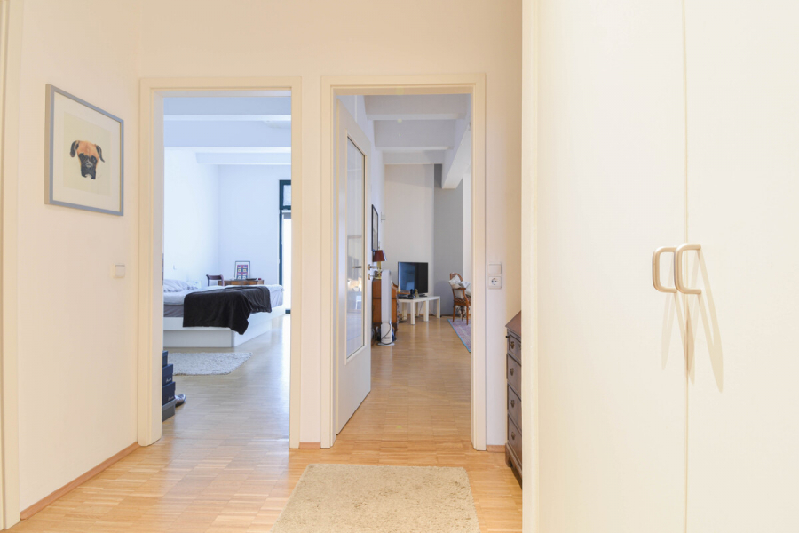 Die Ausstattung folgt einem zurückhaltend eleganten Konzept: Schiffsbodenparkett in den Wohn- und Schlafräumen sowie im Flur sorgt für eine natürliche, warme Anmutung. Die Wände in Putzoptik unterstreichen das ruhige und hochwertige Wohnbild. Im Flur ist ein praktischer Abstellschrank integriert – ideal für Stauraum im Alltag.