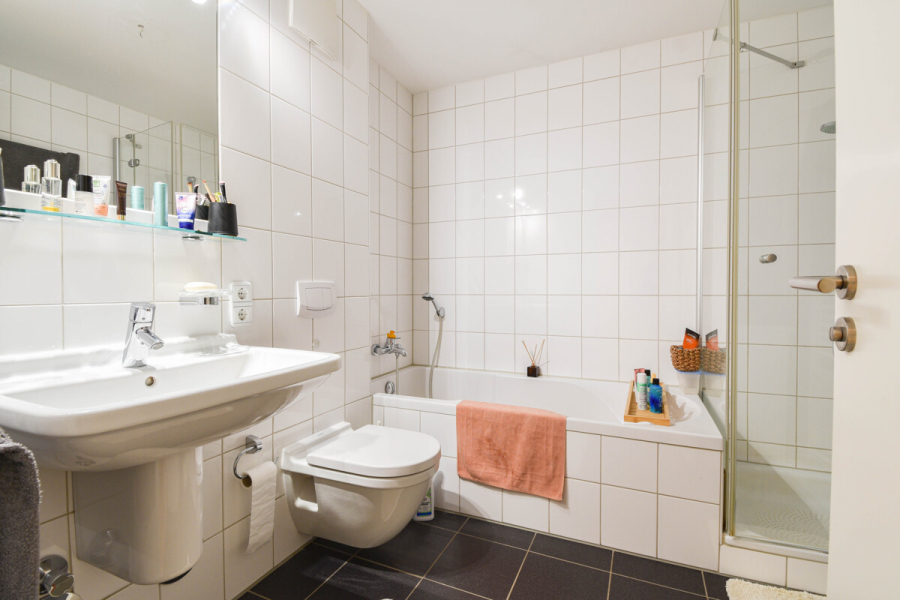 Das komfortable Badezimmer bietet sowohl eine Badewanne als auch eine separate Dusche sowie einen Waschmaschinenanschluss. Hochwertige, türhoch verlegte Fliesen in hellgrauer Optik schaffen eine klare, moderne Atmosphäre.