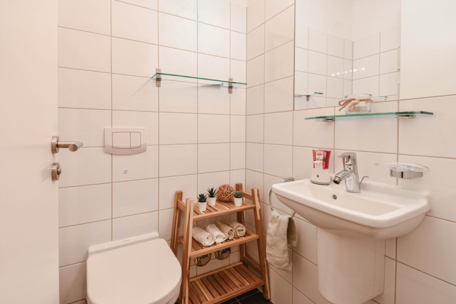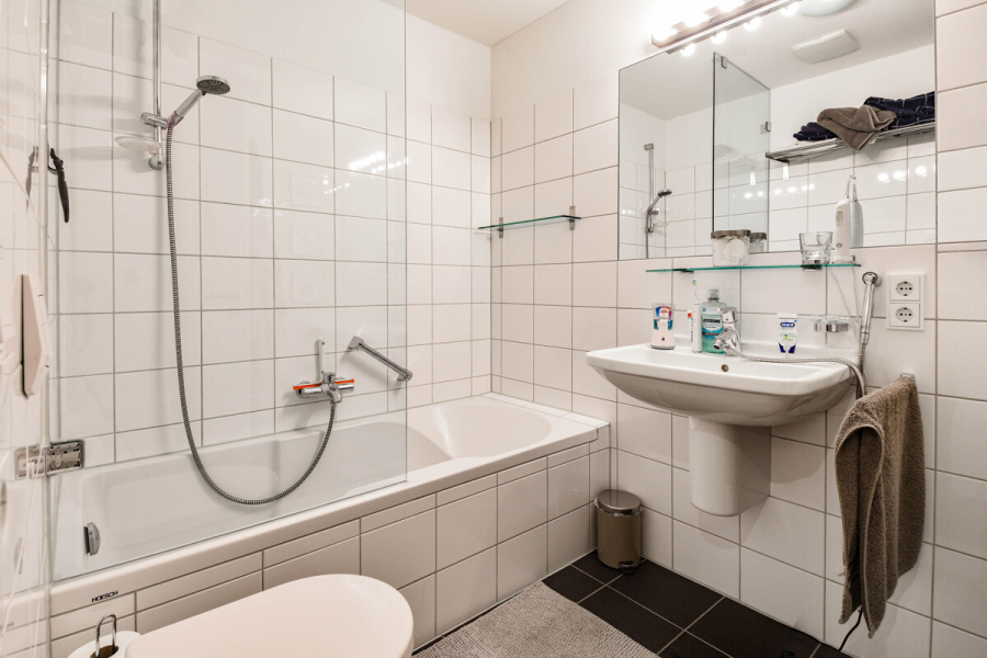 Das großzügige Badezimmer ist mit Badewanne, separater Dusche und einem Waschmaschinenanschluss ausgestattet. Boden- und Wandfliesen in neutraler, moderner Optik sind türhoch verlegt – funktional und ästhetisch zugleich.