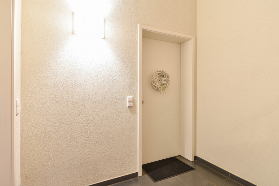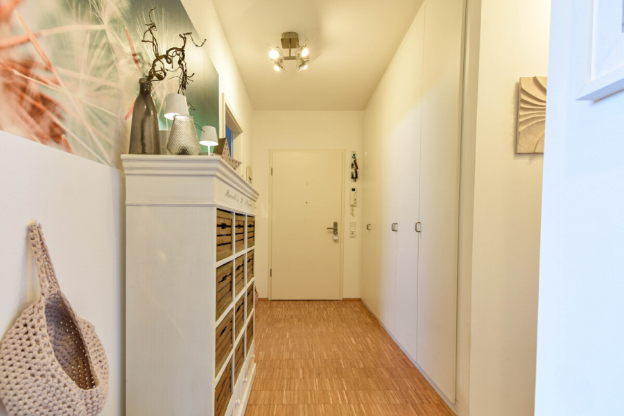 Die Ausstattung ist hochwertig und zurückhaltend zugleich. Schiffsbodenparkett in Wohn-, Schlaf- und Flurbereich verleiht den Räumen eine warme, wohnliche Ausstrahlung. Die Wände in glatter Putzoptik unterstreichen die klare Formsprache der Wohnung.