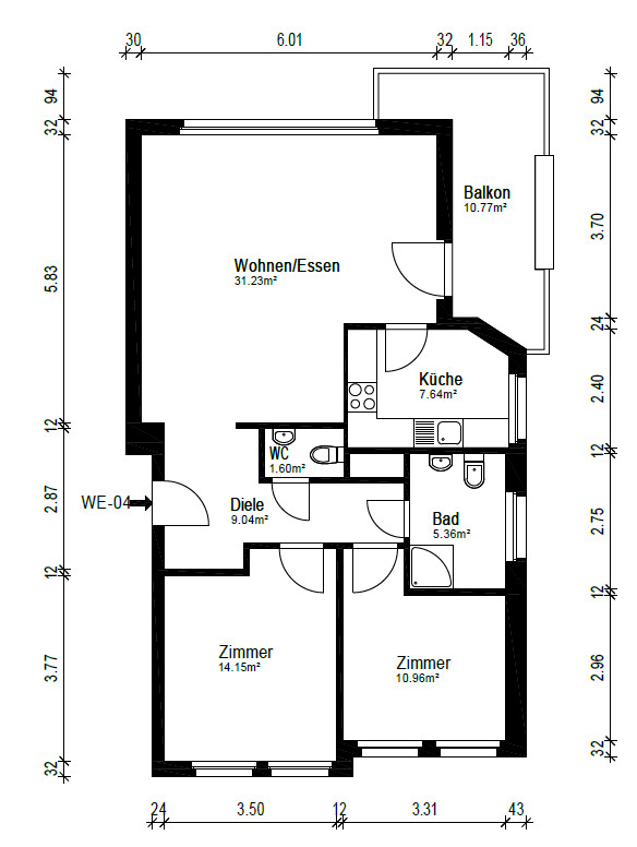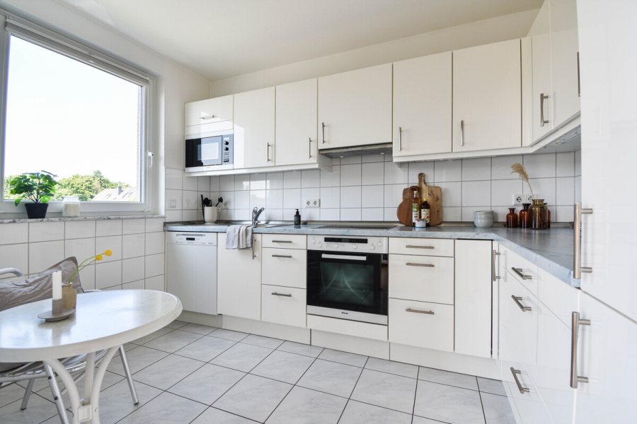 Das großzügige Wohn- und Esszimmer bildet das Herzstück der Wohnung. Eine bodentiefe, große Fensterfront sorgt für ein lichtdurchflutetes, offenes Wohngefühl und schafft gleichzeitig fließende Übergänge zum Außenbereich. Von hier aus gelangt man auf den über Eck geführten Balkon mit ansprechender Ausrichtung – ein idealer Ort zum Durchatmen, Genießen und Entspannen. Die anschließende Küche ist zweckmäßig ausgestattet und funktional konzipiert.