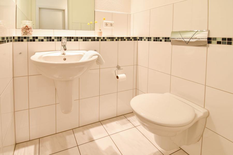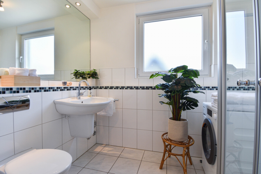 Ein zeitloser Eichenstäbchenparkettboden verleiht den Wohnräumen eine hochwertige Anmutung. In Küche und Bädern sorgen pflegeleichte Fliesen für Alltagstauglichkeit. Die Wohnung verfügt über ein modernes Duschbad mit Waschmaschinenanschluss sowie ein separates Gäste-WC – ein Plus an Komfort.