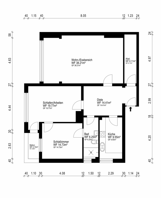 Die beiden Schlafzimmer sind angenehm proportioniert und lassen sich je nach Lebensentwurf flexibel nutzen – ob als klassisches Schlaf-, Kinder- oder Arbeitszimmer. Der Zugang zum Balkon erfolgt über das zur Straße ausgerichtete, zweite Zimmer, welches auch als Büro oder Gästezimmer genutzt werden kann. Mit seiner Westausrichtung bietet der Balkon sonnige Nachmittage und Abendstunden – ein urbaner Rückzugsort, der das Wohnerlebnis angenehm ergänzt.