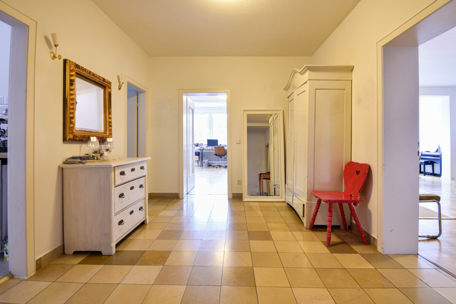 Sie werden empfangen von einer weitläufigen Diele, die als zentraler Verteiler in die Räume fungiert und zugleich ein repräsentatives Entree bildet. Das außergewöhnlich große Wohn- und Esszimmer überzeugt mit einer lichtdurchfluteten Atmosphäre, die durch großzügige Fensterflächen getragen wird. Der Raum vermittelt Großzügigkeit und zugleich wohnliche Geborgenheit – ein idealer Mittelpunkt für gemeinsames Leben und gemütliches Entspannen.
