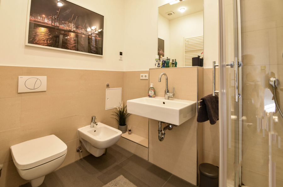 Die stilvolle 2 -Zimmerwohnung bietet ein großes Wohn-/Esszimmer mit offener Küche und Loggia, von der Sie einen wunderschönen Blick in den begrünten Innenhof genießen können. Das Schlafzimmer erreichen Sie über einen Zwischenflur, der Platz für einen kleinen Einbauschrank bietet. Das Duschbad ist mit WC/ Bidet und Waschtisch ausgestattet.