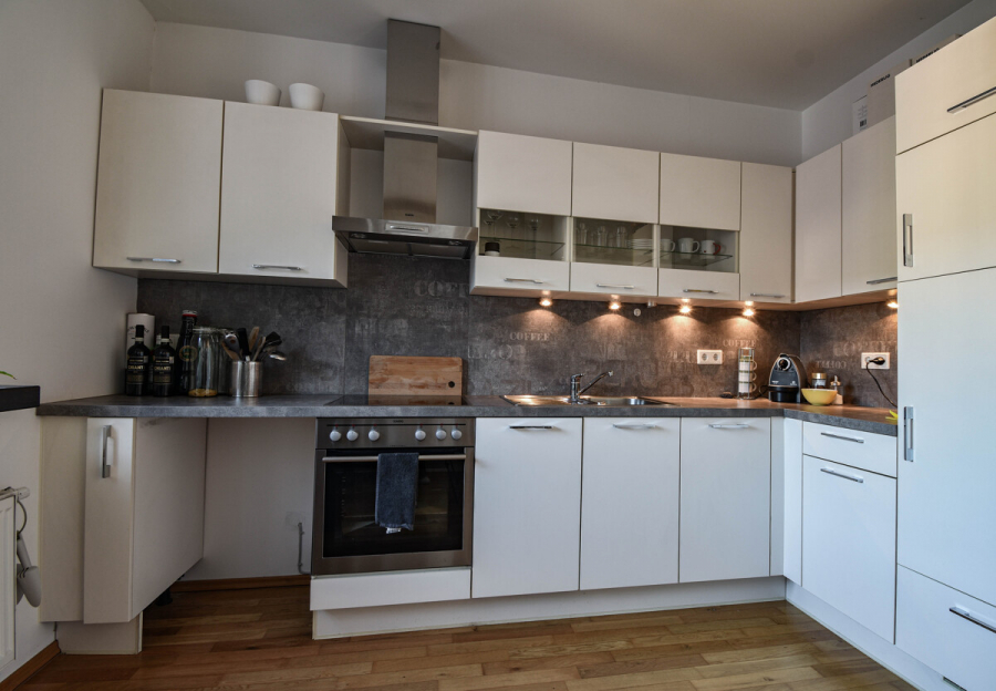 Die hochwertig ausgestattete Einbauküche – samt moderner Markengeräte – ist im Kaufpreis enthalten.
