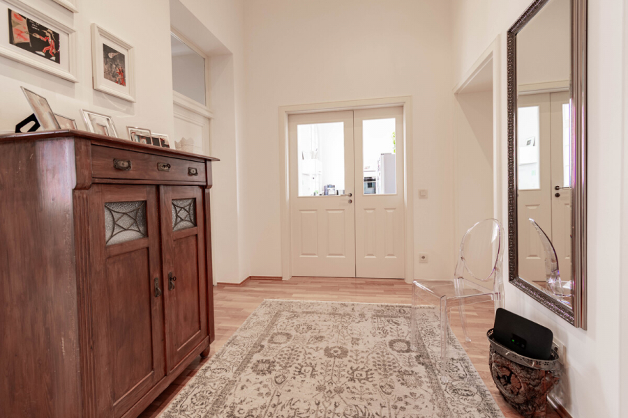 Die geräumige Diele mit nahezu zimmerähnlichen Proportionen schafft ein einladendes Entrée und eröffnet flexible Nutzungsmöglichkeiten als Garderobenbereich, Leseecke oder zusätzlicher Stauraum.