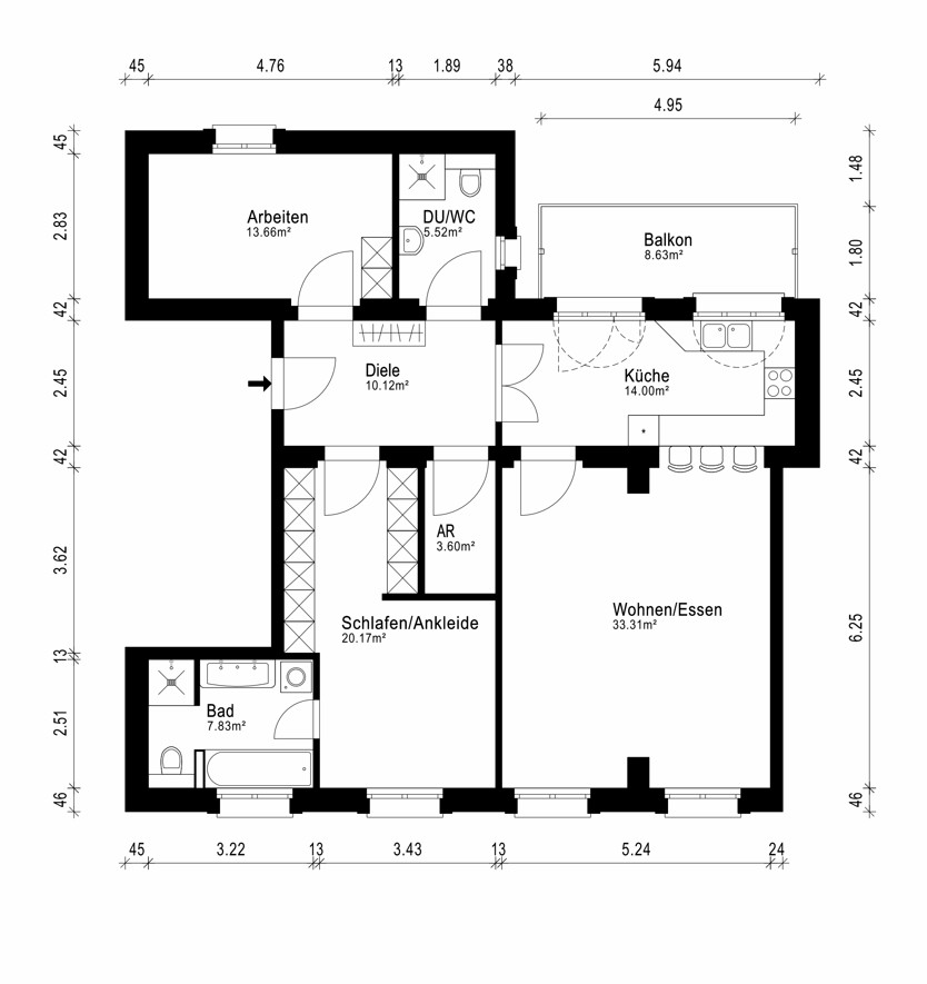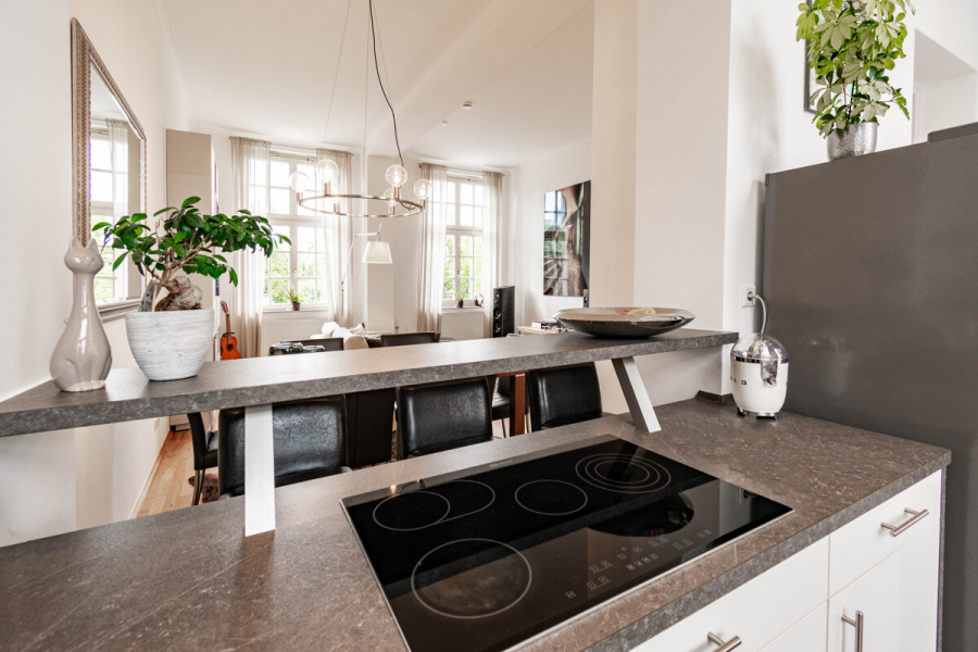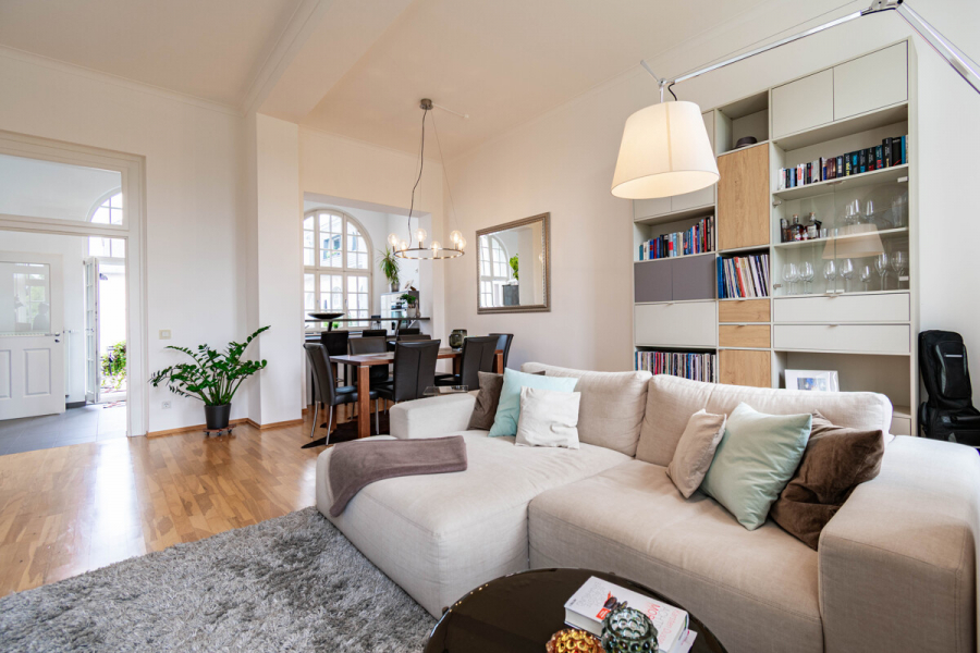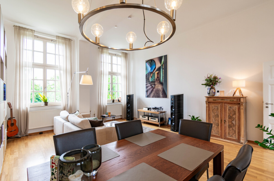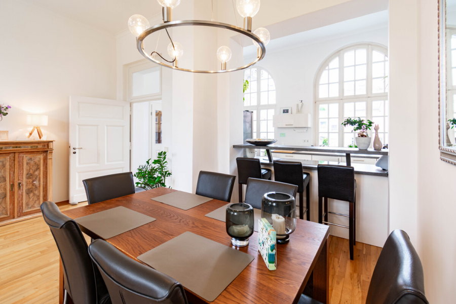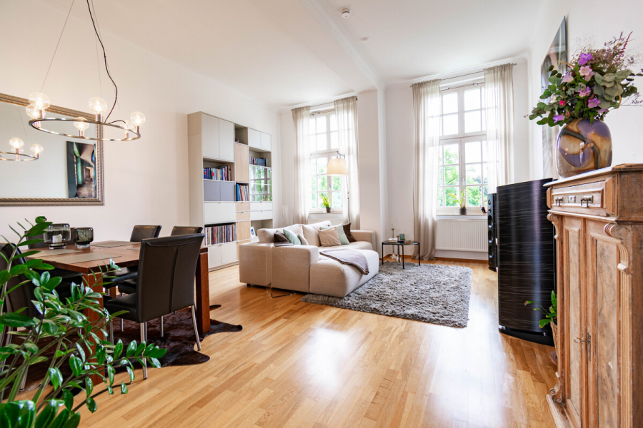 Mit 110,37 m² Wohnfläche bietet die Wohnung ein stimmiges Raumkonzept für anspruchsvolle Stadtmenschen, die Wert auf Ästhetik, Funktionalität und ein gepflegtes Wohnumfeld legen. Drei Zimmer verteilen sich großzügig auf einer Ebene. Herzstück der Wohnung ist das helle Wohn-/Esszimmer mit rund drei Meter hohen Decken – eine einladende Wohnlandschaft mit stilvoller Offenheit und eleganter Verbindung zur Küche durch eine praktische Durchreiche mit Thekenlösung.
