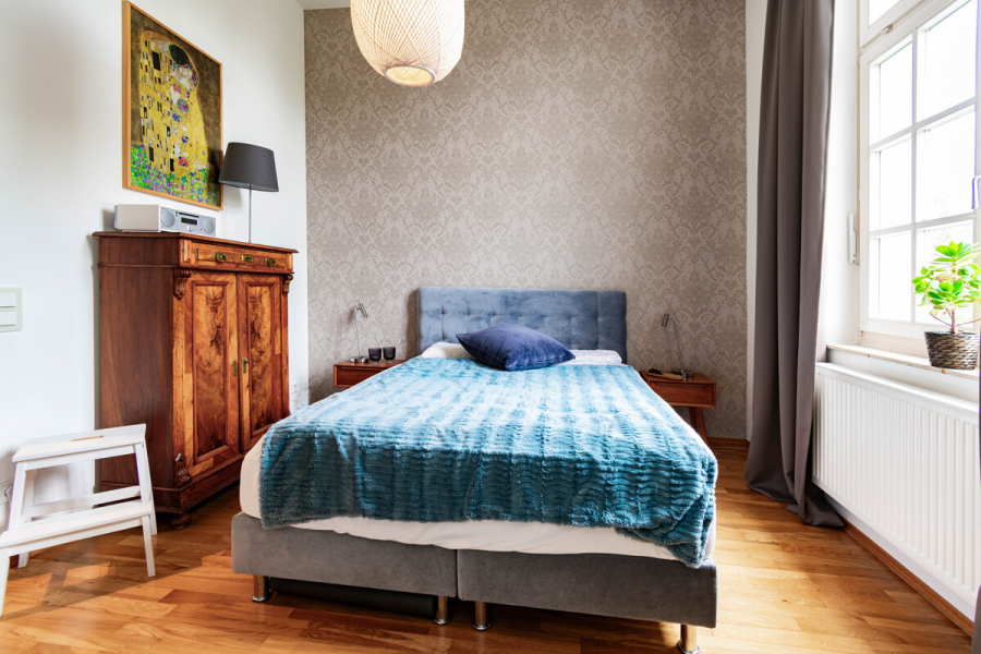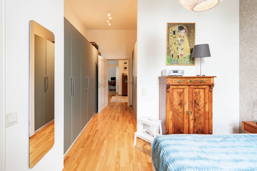 Das Schlafzimmer ist komfortabel geschnitten und verfügt über direkten Zugang zum stilvollen Masterbad mit Dusche, Badewanne und edlem Design. Besonders hervorzuheben sind die Schrankmodule (können ggf. mit erworben werden), die dezent in vorhandene Nischen integriert wurden und so eleganten Stauraum schaffen, ohne den harmonischen Raumeindruck zu beeinträchtigen.