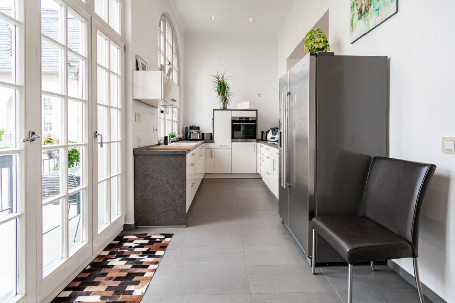 Die hochwertig ausgestattete Einbauküche – samt moderner Markengeräte – ist im Kaufpreis enthalten. Über bodentiefe Fenster gelangt man von hier direkt auf den geschützten Balkon, der mit seiner angenehmen Größe zum Verweilen einlädt und einen ruhigen Blick in den begrünten Innenhof freigibt.