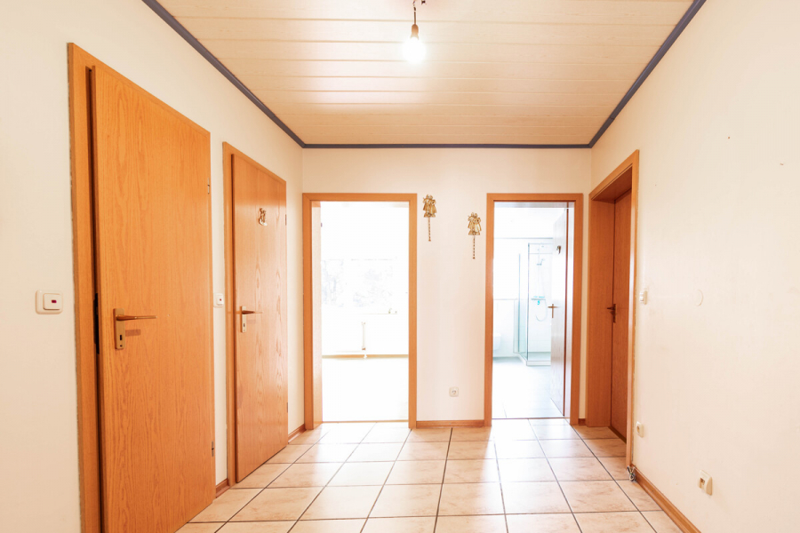 Die Wohnung verfügt über drei gut geschnittene, helle Zimmer. Das Wohn- und Esszimmer ist besonders großzügig und bietet Zugang zu einer geschützten Loggia, die durch die Lage im ersten Obergeschoss nahezu uneinsehbar ist. In den beiden Schlafräumen wurde hochwertiger Eichenparkett verlegt, während in den übrigen Bereichen helle, pflegeleichte Fliesen für eine freundliche Atmosphäre sorgen.