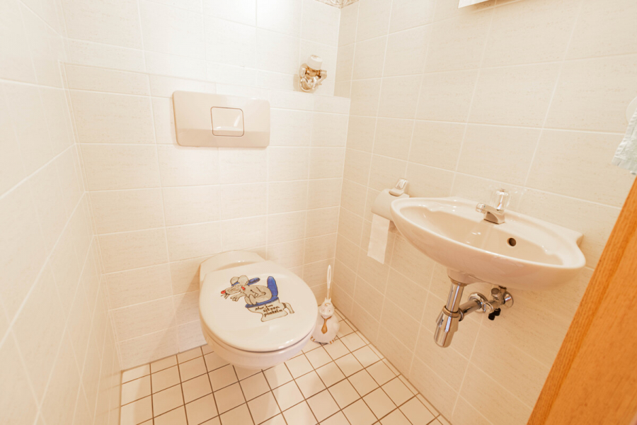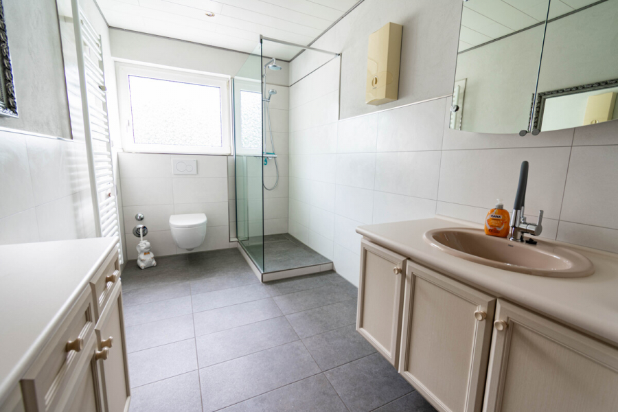 Das Badezimmer ist teilweise modern gestaltet, mit großformatigen, hellgrauen Fliesen sowie einer nahezu ebenerdigen Dusche ausgestattet. Ergänzt wird die Ausstattung durch ein separates Gäste-WC sowie einen praktischen Abstellraum innerhalb der Wohnung. Alle Fenster verfügen über elektrische, isolierte Jalousien.