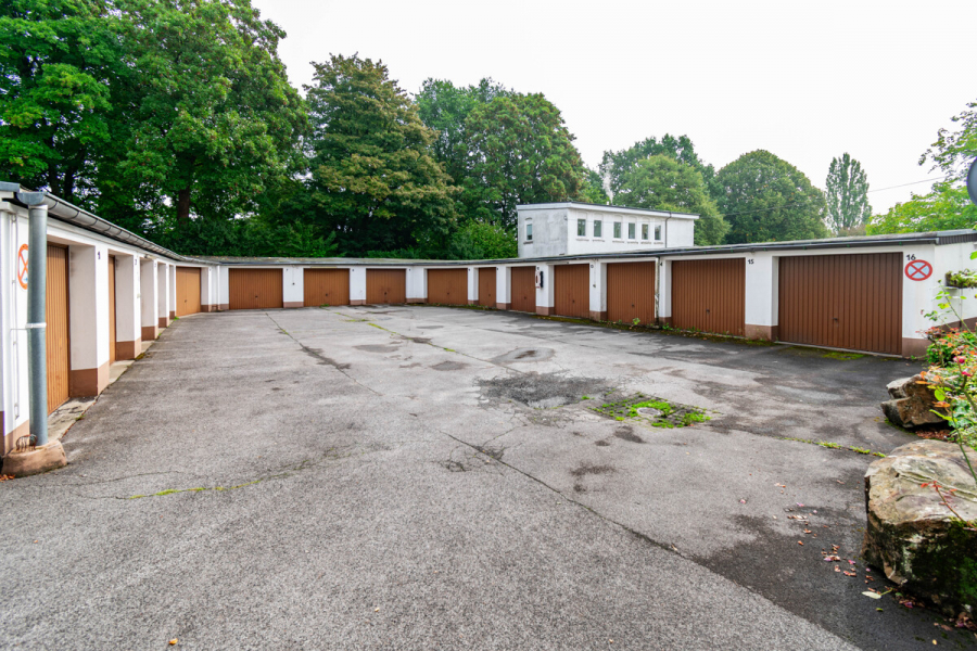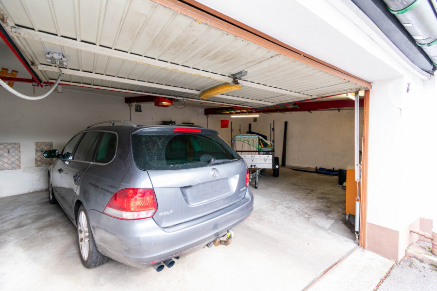 Zur Wohnung gehört eine großzügige Eckgarage mit elektrischem Tor und Stromanschluss. Sie bietet neben zwei PKW-Stellplätzen auch ausreichend Platz für Fahrräder, Werkzeug oder eine kleine Werkbank. Darüber hinaus stehen im gemeinschaftlichen Keller eine Waschküche, ein abschließbarer eigener Kellerraum sowie ein Fahrradkeller zur Verfügung.