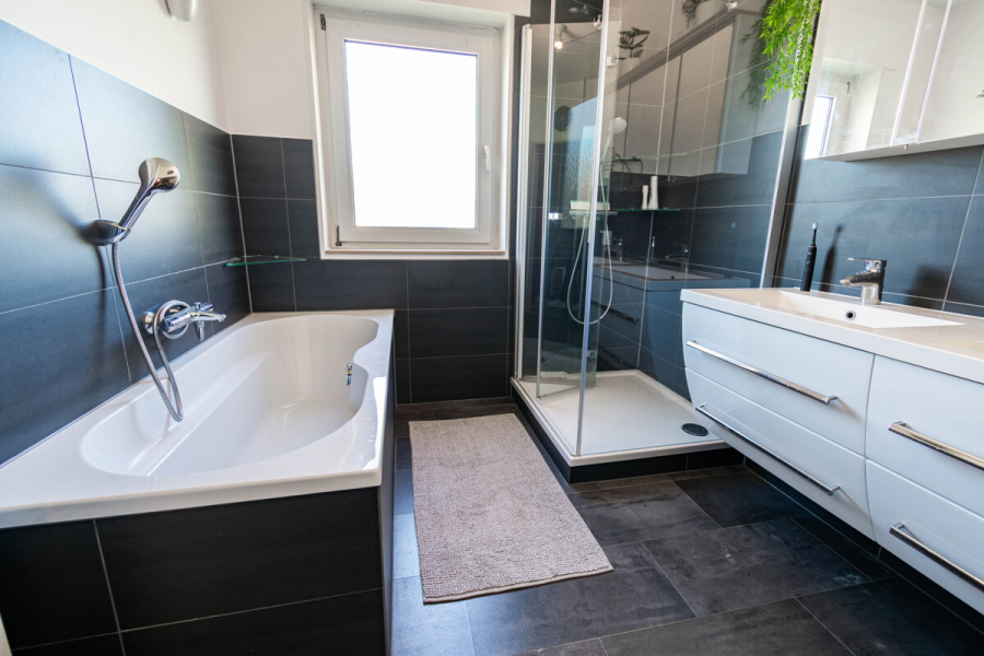 Ein helles Tageslichtbad mit Badewanne und ebenerdiger Dusche ergänzt das Angebot ebenso wie ein separates, geschmackvoll gestaltetes WC. Zwei gut geschnittene Schlafzimmer, eine begehbare Garderobe sowie ein praktischer Abstellraum, allesamt von der zentralen Diele aus begehbar, vervollständigen den funktionalen und zugleich wohnlichen Grundriss.
