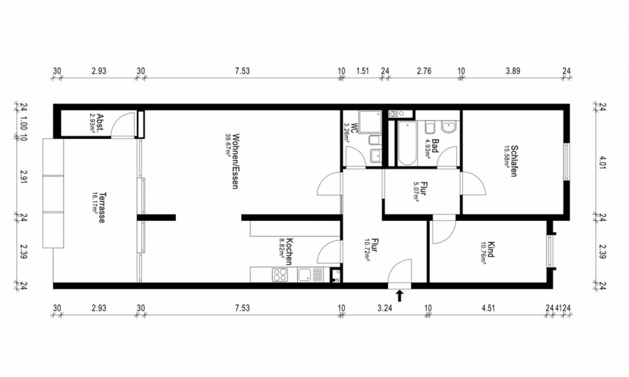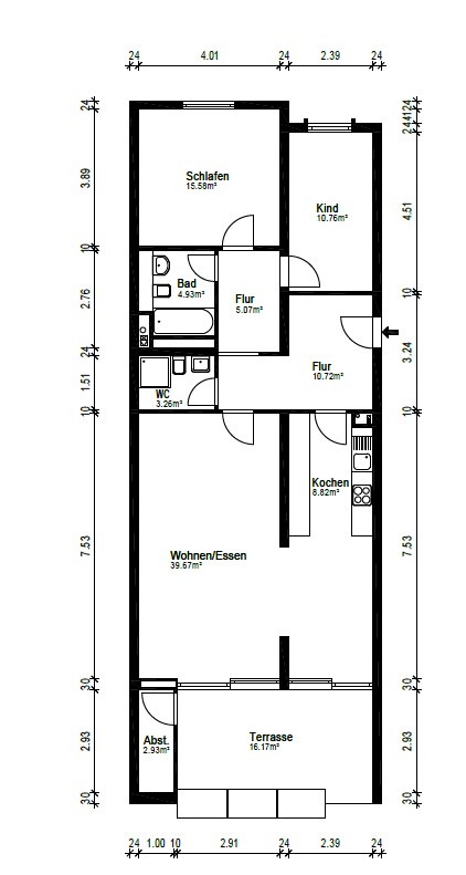 Die Wohnung verfügt über drei gut geschnittene Zimmer, darunter ein geräumiges Wohn- und Esszimmer mit direktem Zugang zum Balkon, ein Schlafzimmer mit elektrischen Jalousien sowie ein drittes Zimmer, das sich flexibel als Arbeits-, Gäste- oder Kinderzimmer nutzen lässt. Das Badezimmer ist mit Badewanne, das Gäste-WC mit Dusche ausgestattet – ein Pluspunkt für Alltagstauglichkeit. Ergänzt wird das Raumangebot durch funktionale Flächen wie die Diele und eine praktische Küche.