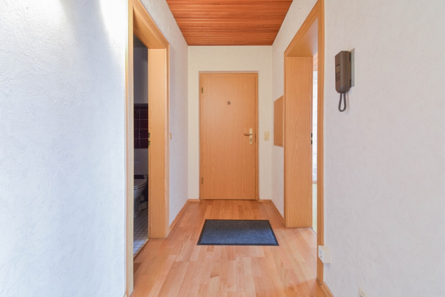 Die Diele verbindet die einzelnen Räume auf praktische Weise. Das innenliegende Badezimmer entspricht noch dem ursprünglichen Baujahrsstandard und bietet – ebenso wie weitere Bereiche der Wohnung – die Möglichkeit, durch eine Sanierung einen zeitgemäßen Wohnkomfort zu schaffen.