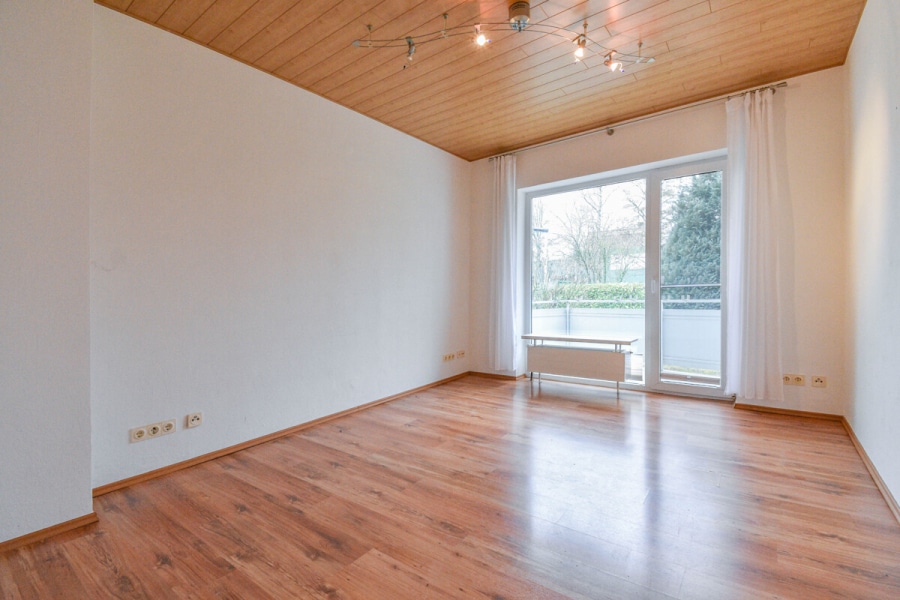 Das Wohnzimmer bildet den Mittelpunkt der Wohnung und bietet dank seines Zuschnitts vielfältige Einrichtungsmöglichkeiten. Von hier aus gelangen Sie direkt auf den Balkon, der einen schönen Blick ins Grüne eröffnet und zu entspannten Stunden im Freien einlädt. Der Balkon stellt eine wertvolle Erweiterung des Wohnraums dar und erhöht die Wohnqualität zusätzlich.