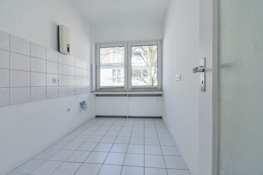 Die separate Küche ist funktional geschnitten und bietet dank heller Fliesen sowie eines großen Fensters gute Lichtverhältnisse und eine angenehme Belüftung. Das Schlafzimmer präsentiert sich ebenfalls hell und gut geschnitten, sodass es sich flexibel möblieren lässt und ausreichend Platz für Bett und Kleiderschrank bietet.