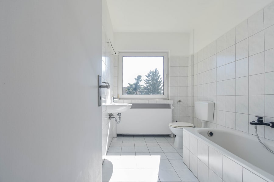 Das Badezimmer ist zeitlos weiß gefliest und mit einer Badewanne ausgestattet. Ein Fenster sorgt für Tageslicht und ermöglicht eine komfortable Belüftung.