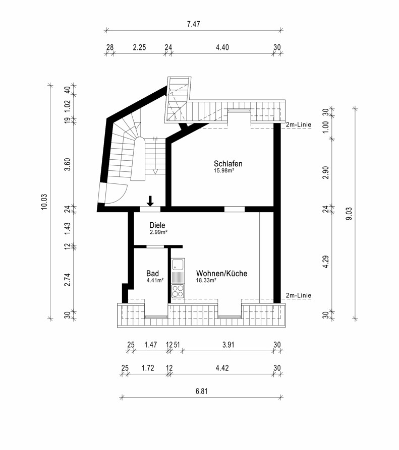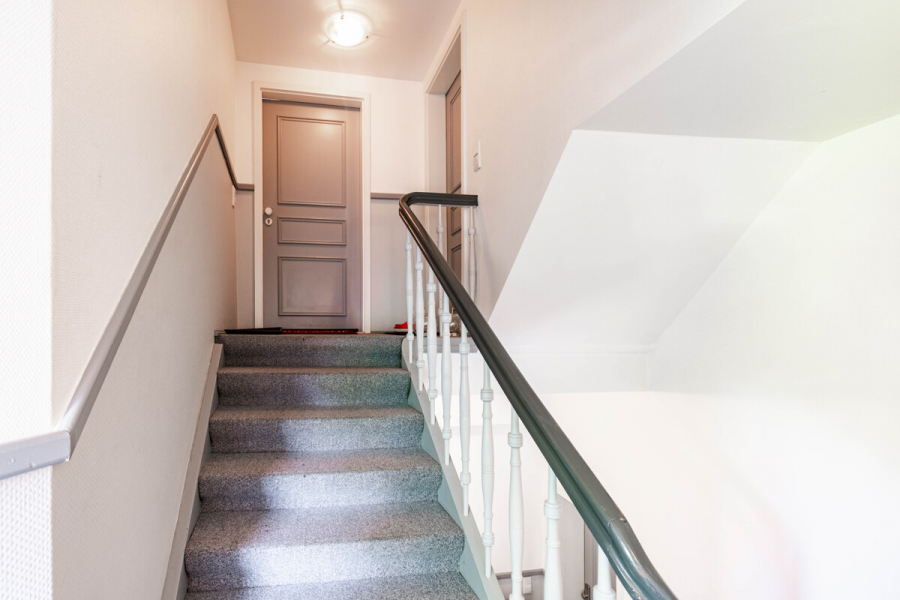 Das Schlafzimmer ist nach hinten ausgerichtet und bietet ausreichend Rückzugsqualität. Das Tageslichtbad ist mit einer Badewanne ausgestattet und durch seinen Zuschnitt funktional und alltagstauglich – inklusive eines Waschmaschinenanschlusses. Ein praktisch integrierter Einbauschrank sorgt im Eingangsbereich für zusätzlichen Stauraum – ebenso wie der separate Kellerraum im Untergeschoss.