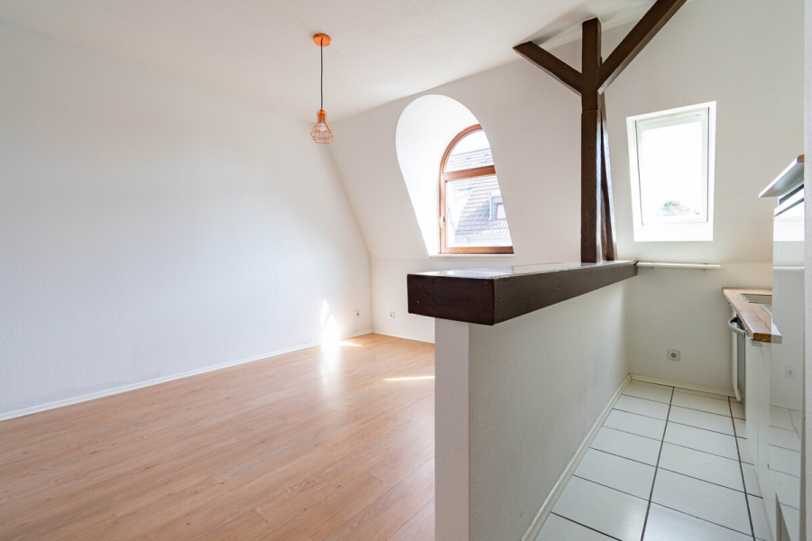 Die Wohnung besticht durch eine offene, lichtdurchflutete Raumstruktur mit sichtbarem Gebälk und wohnlicher Gemütlichkeit. Der offen gestaltete Wohnbereich geht nahtlos in eine funktionale Wohnküche mit Einbauküche und Theke. Die rustikale Gebälkstruktur verleiht dem Raum eine ganz eigene Ausstrahlung, die durch das durchgängige Laminat und die wohnliche Lichtführung angenehm ergänzt wird.