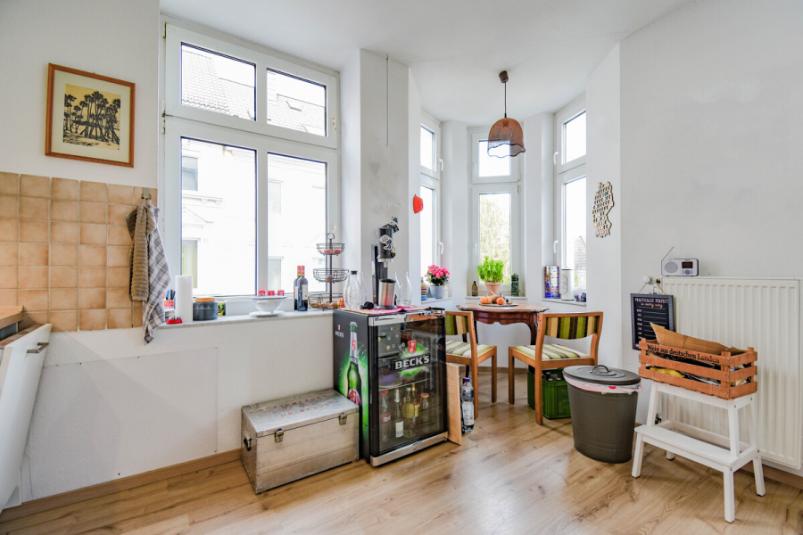 Die Wohnung besticht durch ihre durchdachte Raumaufteilung und helle Atmosphäre. Der Wohnbereich verfügt über einen Balkon, der zusätzlichen Freiraum im Alltag schafft. Die Küche ist mit einem charmanten Erker ausgestattet, der für viel Tageslicht sorgt und Platz für einen gemütlichen Essbereich bietet. Das Badezimmer ist in klassischem Weiß gehalten und verfügt über ein Fenster. Praktische Details wie Stauraum in der Flurdecke sowie ein separater Abstellbereich runden das Angebot ab.